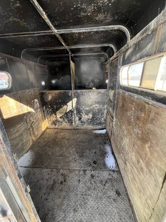 Nice older horse trailer for sale!! Needs some small pieces of aluminum to cover some areas. The floor wood and steel is good. One tire has slow leak. Never checked lights, good bulldog hitch, it clamps around 2 ball and will not come off till you pull steel cover. This hitch is made so when a horse steps in, trailer hitch will not pop off.